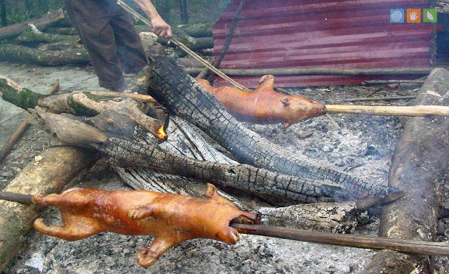 Vào các dịp lễ, Tết, đồng bào các dân tộc thường tổ chức quay lợn làm lễ và liên hoan. Giống lợn quay là lợn do dân bản nuôi thả trong vườn rừng, chất lượng thịt rất cao. Quan trọng nhất là khâu ướp gia vị cho lợn quay, muối tiêu được xát đều trong bụng lợn cho ngấm rồi lấy lá mắc mật rửa sạch cho vào bụng lợn. Lợn quay xong thì để nguội rồi mới chặt để thịt không bị nát, xếp ra đĩa rồi ăn, thịt ăn chắc, có vị ngọt của thịt chín tới, mùi thơm của lá mắc mật và vị béo ngậy của mật ong rừng.